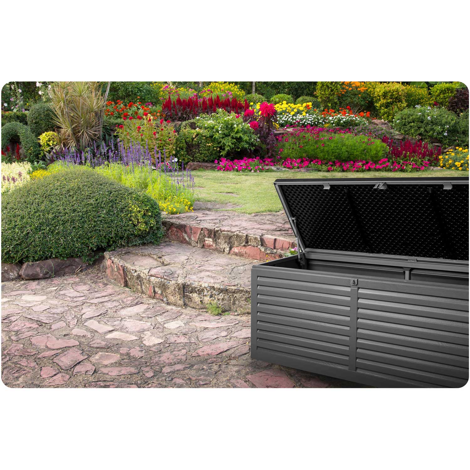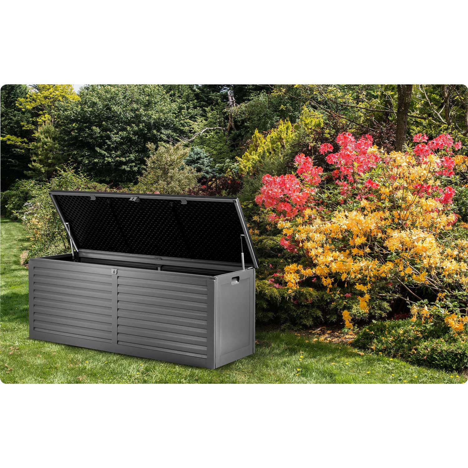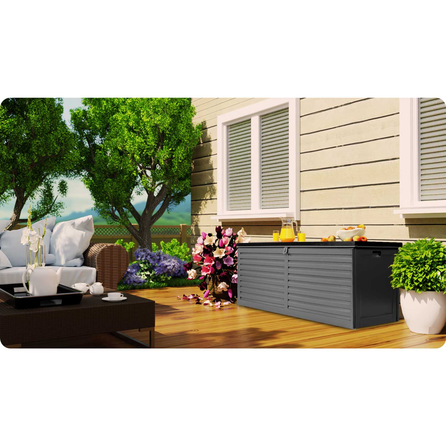 Pojemna skrzynia ogrodowa ułatwia przechowywanie w ogrodzie, na balkonie oraz wokół domu niezbędnych rzeczy które użytkujemy na co dzień (poduszki, materace, pokrowce, zabawki, narzędzia) oraz wiele innych rzeczy.