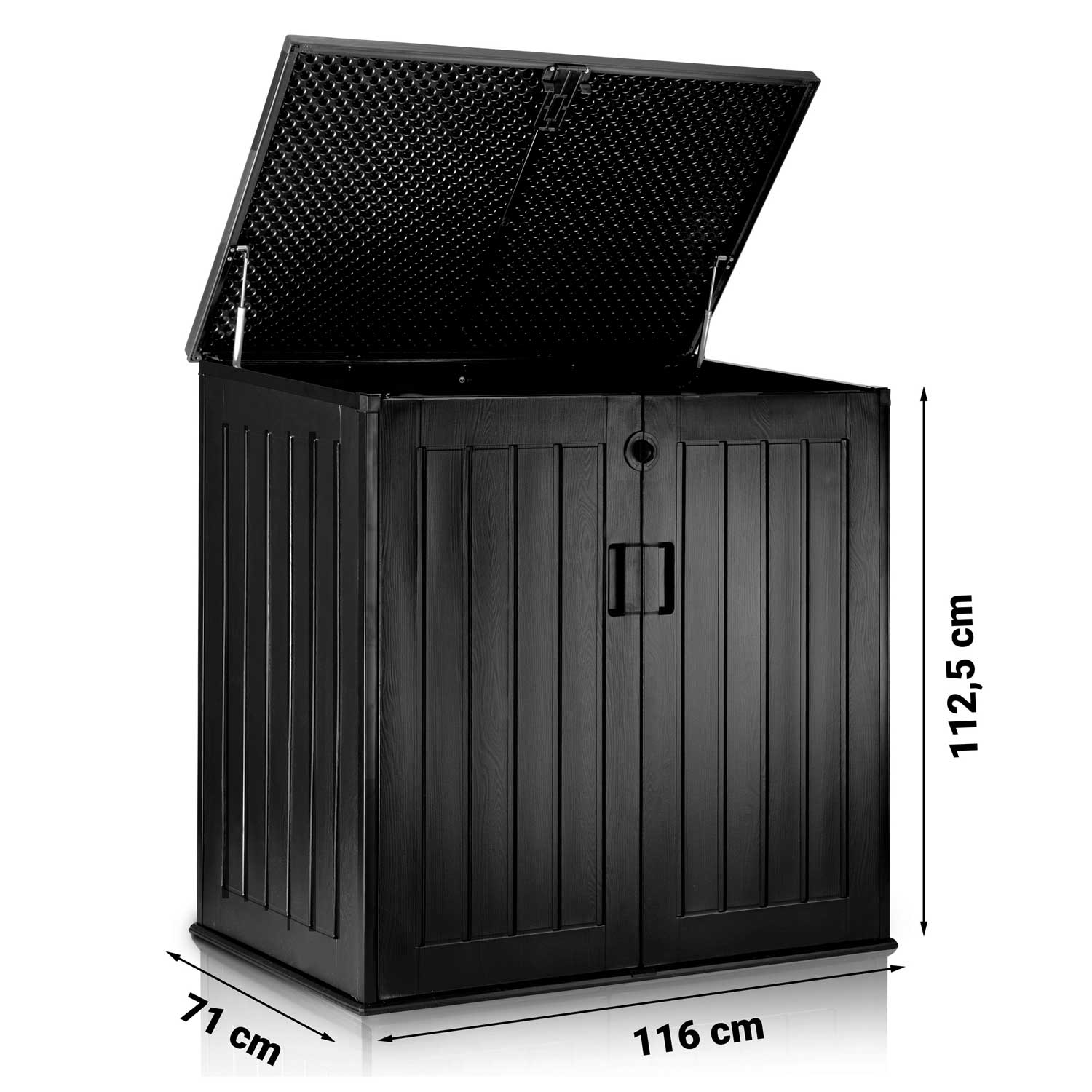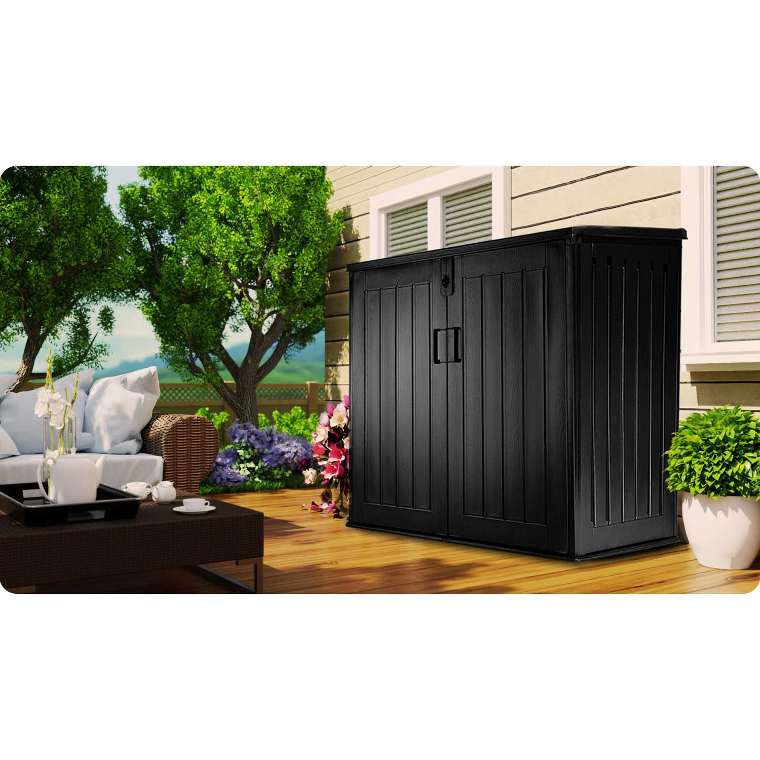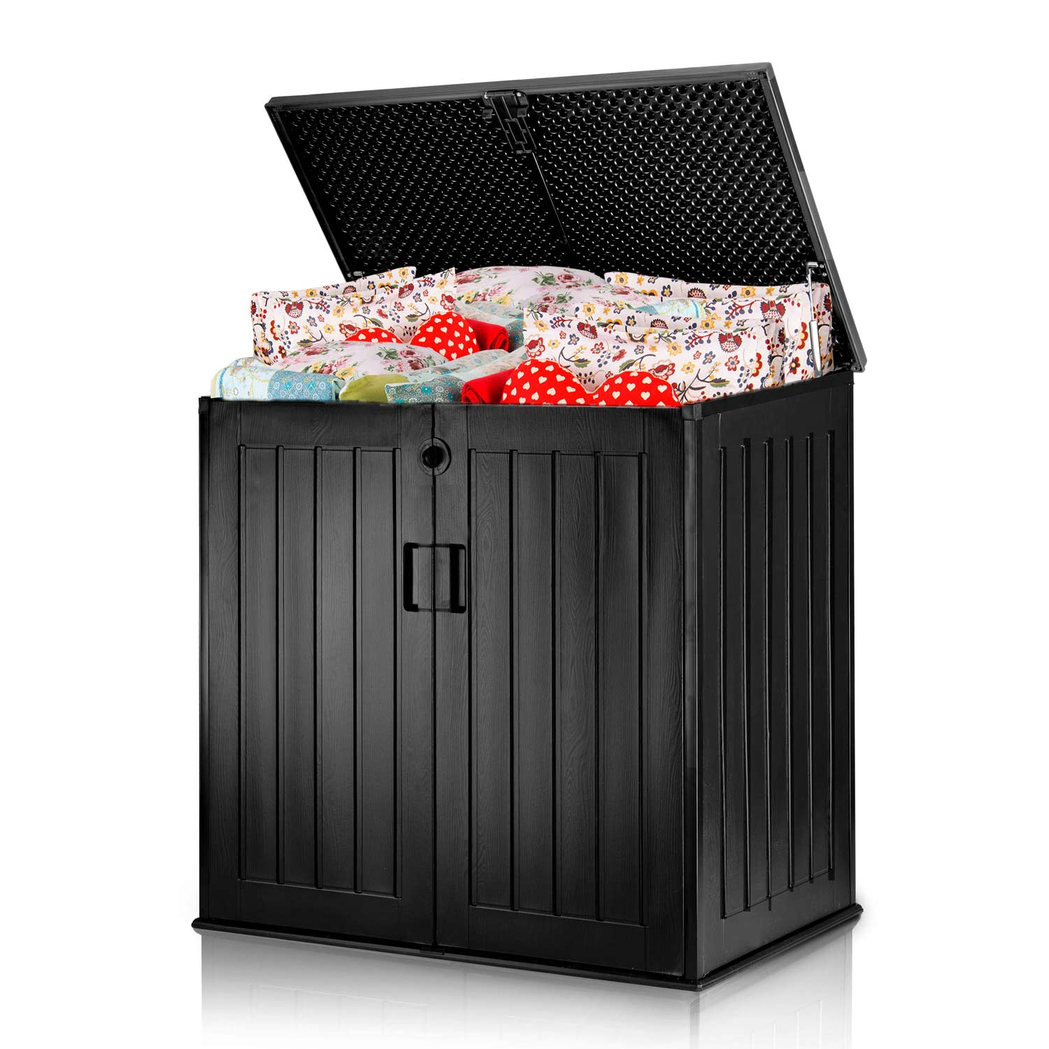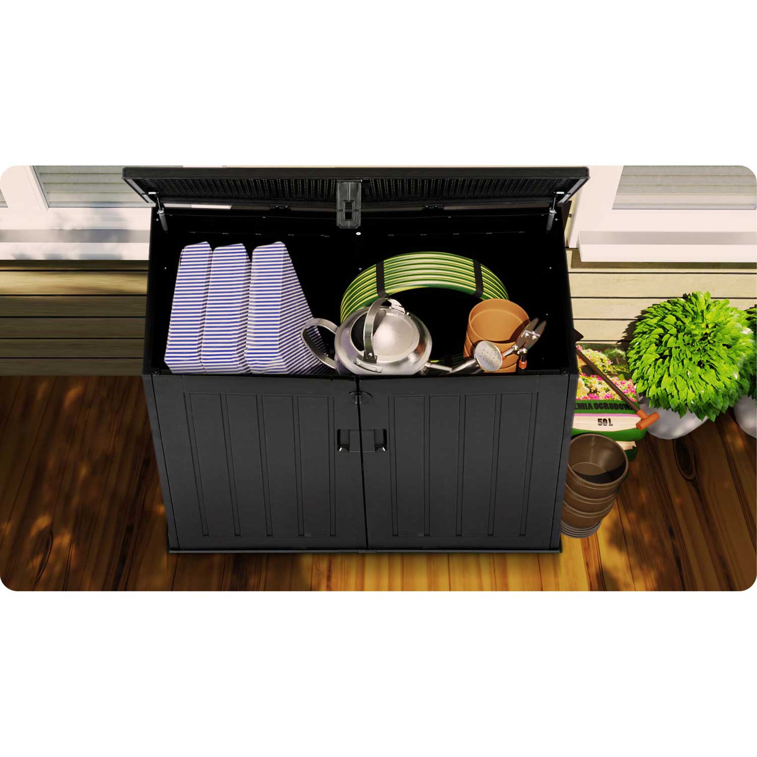 Pojemna skrzynia ogrodowa ułatwia przechowywanie w ogrodzie, na balkonie oraz wokół domu niezbędnych rzeczy które użytkujemy na co dzień (poduszki, materace, pokrowce, zabawki, narzędzia) oraz wiele innych rzeczy.