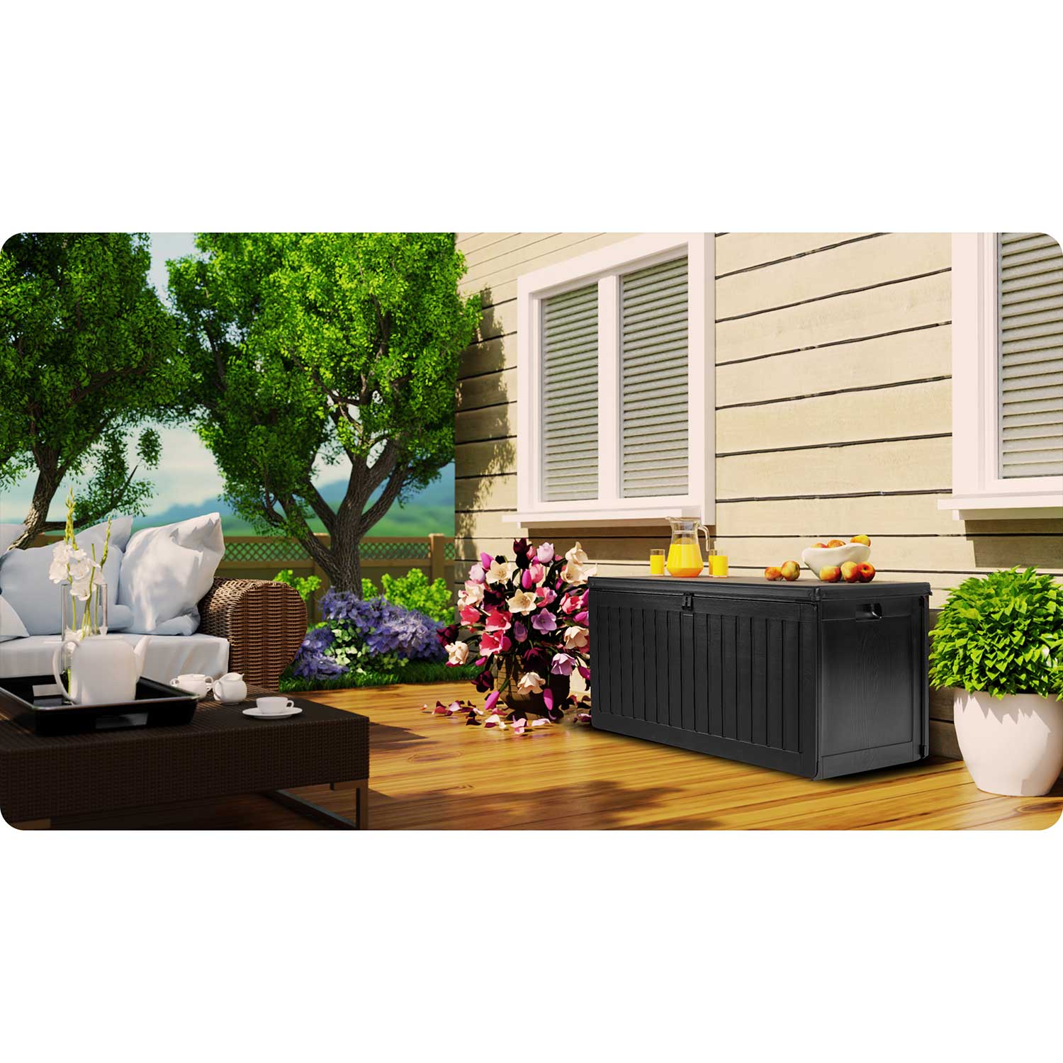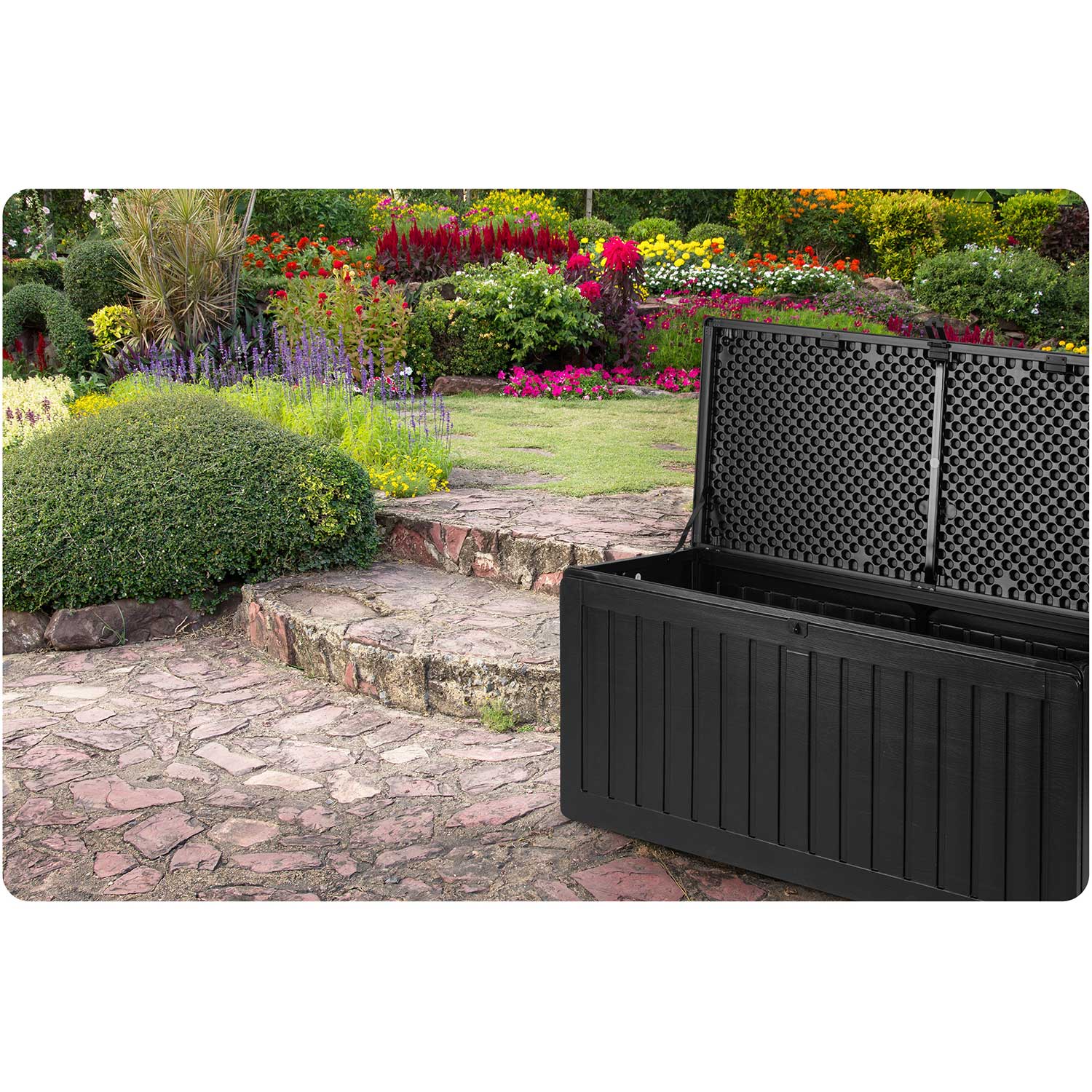 Pojemna skrzynia ogrodowa ułatwia przechowywanie w ogrodzie, na balkonie oraz wokół domu niezbędnych rzeczy, które użytkujemy na co dzień (poduszki, materace, pokrowce, zabawki, narzędzia) oraz wiele innych rzeczy.