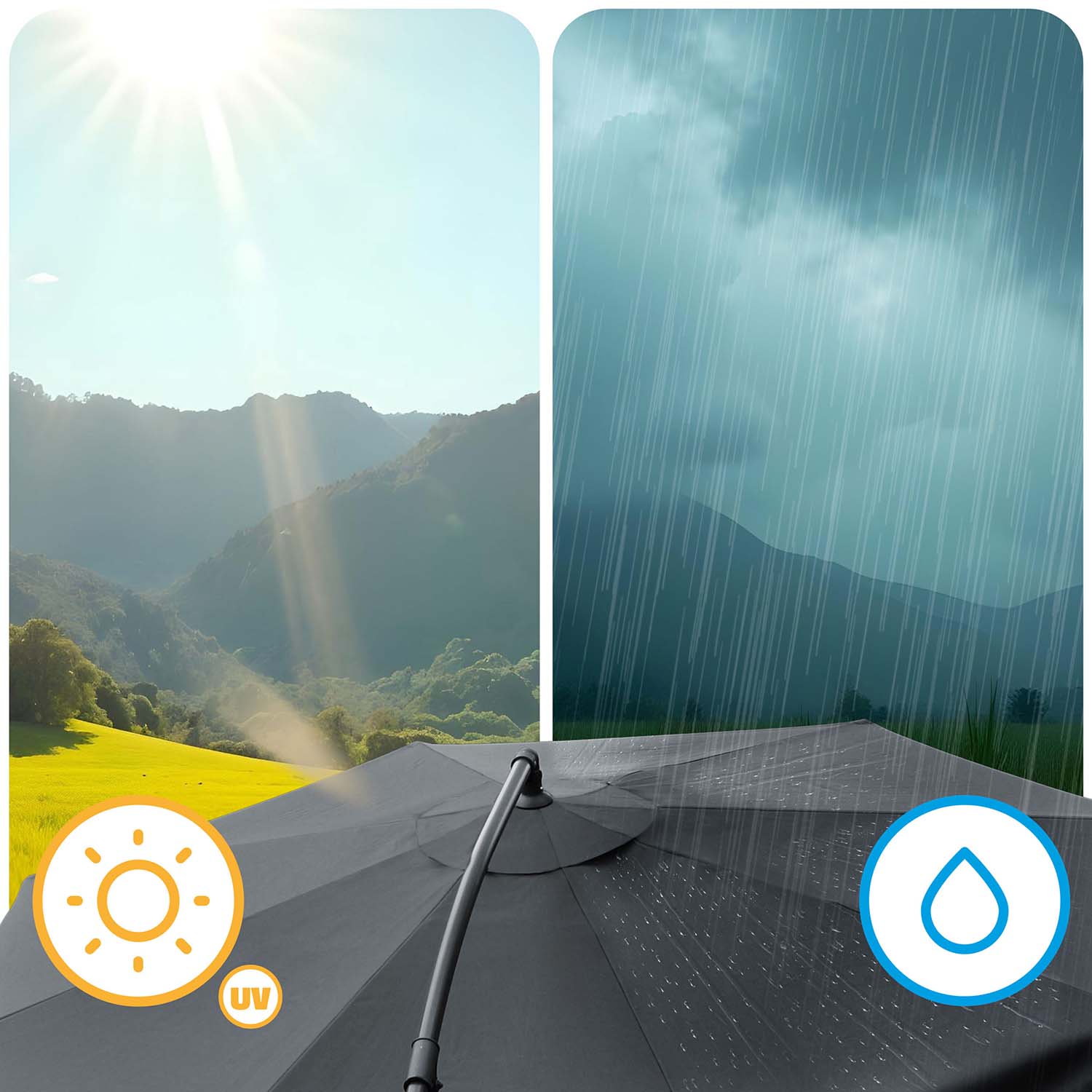 Pokrowiec z wytrzymałego materiału Oxford doskonale chroni parasol przed szkodliwym działaniem promieni UV i innymi czynnikami atmosferycznymi, zapobiegając blaknięciu materiału oraz wydłużając jego żywotność.