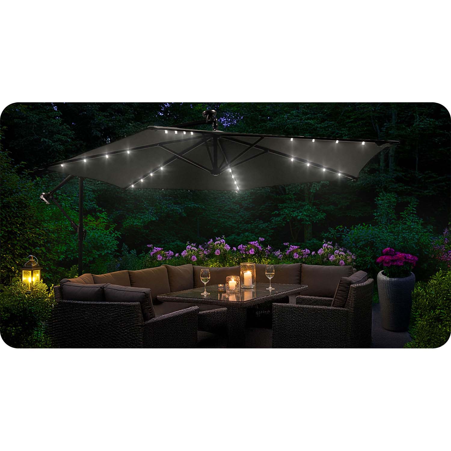 Panel UV na parasolu z lampkami LED umożliwia spędzenie całej nocy w przytulnym blasku, dzięki energooszczędnemu zasilaniu panelu słonecznego o wymiarach 80 x 80 mm.