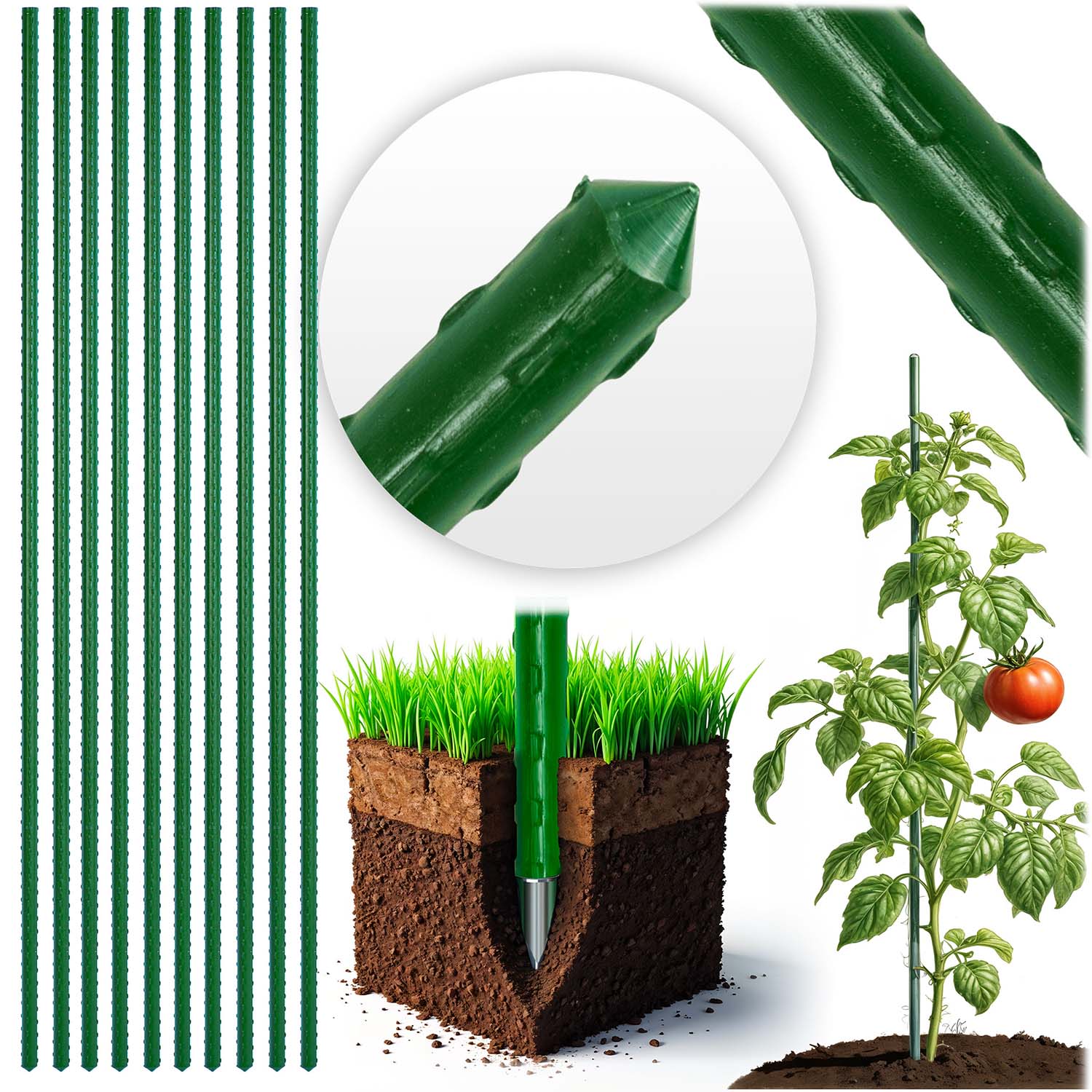 Wzmocniona końcówka i solidne osadzenie w ziemi zapewniają idealne podparcie nawet dla ciężkich, owocujących roślin.