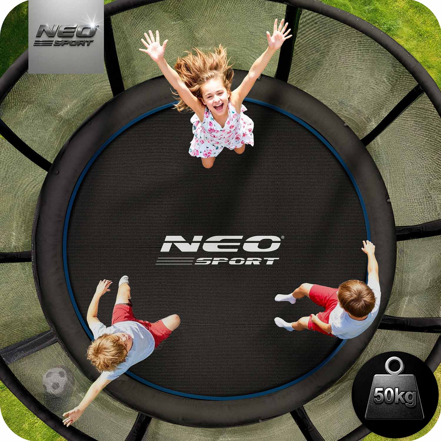 Trampolina NEO SPORT o imponującej średnicy 183 cm zapewnia mnóstwo miejsca do skakania – idealna dla dzieci i dorosłych!