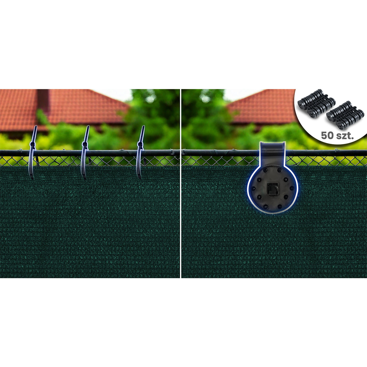 Profesjonalne zaciski w zestawie (50 sztuk) znacząco ułatwiają montaż siatki. Dzięki nim szybko i stabilnie przymocujesz osłonę do ogrodzenia, bez potrzeby stosowania dodatkowych narzędzi.