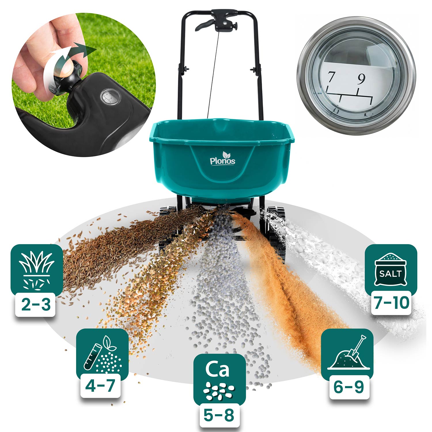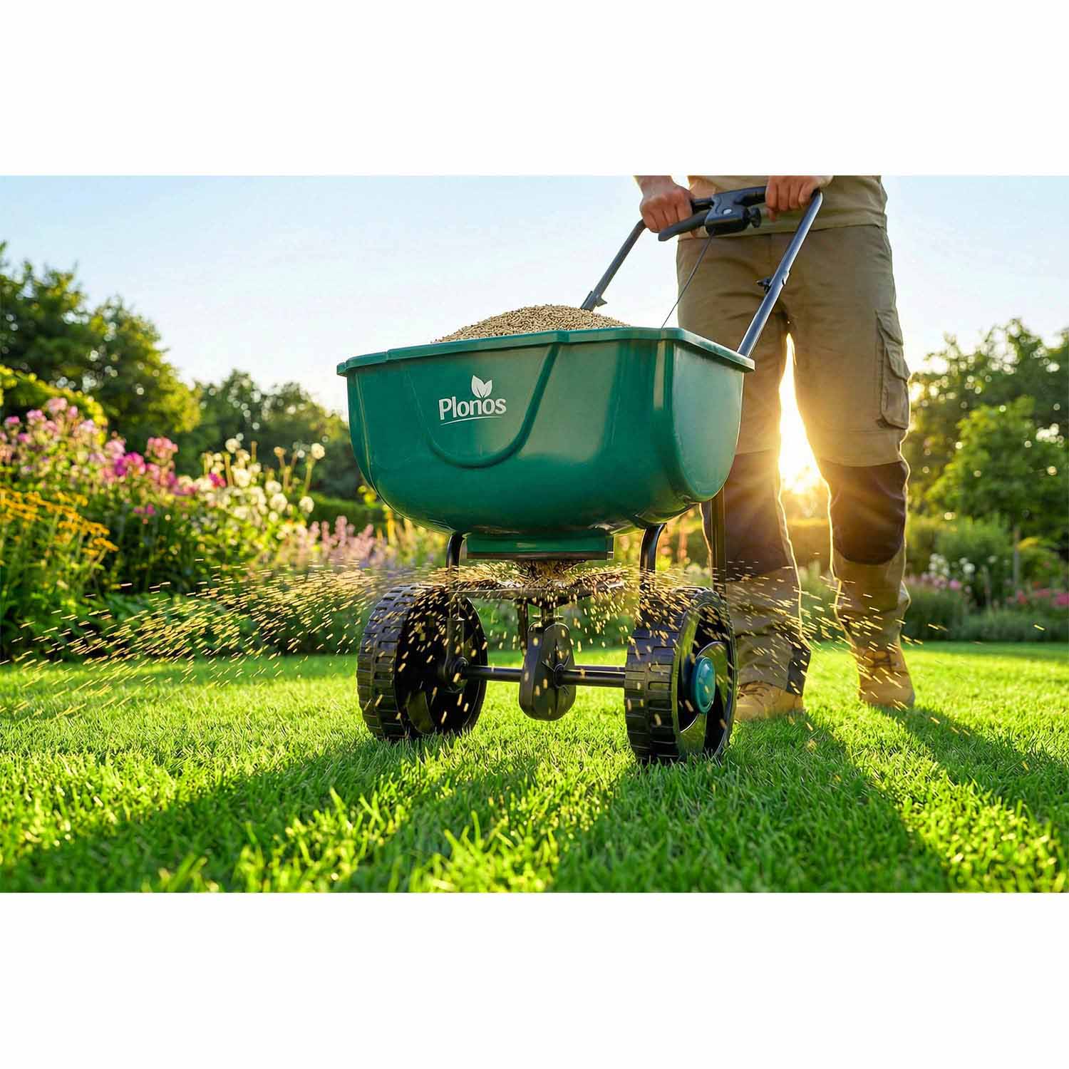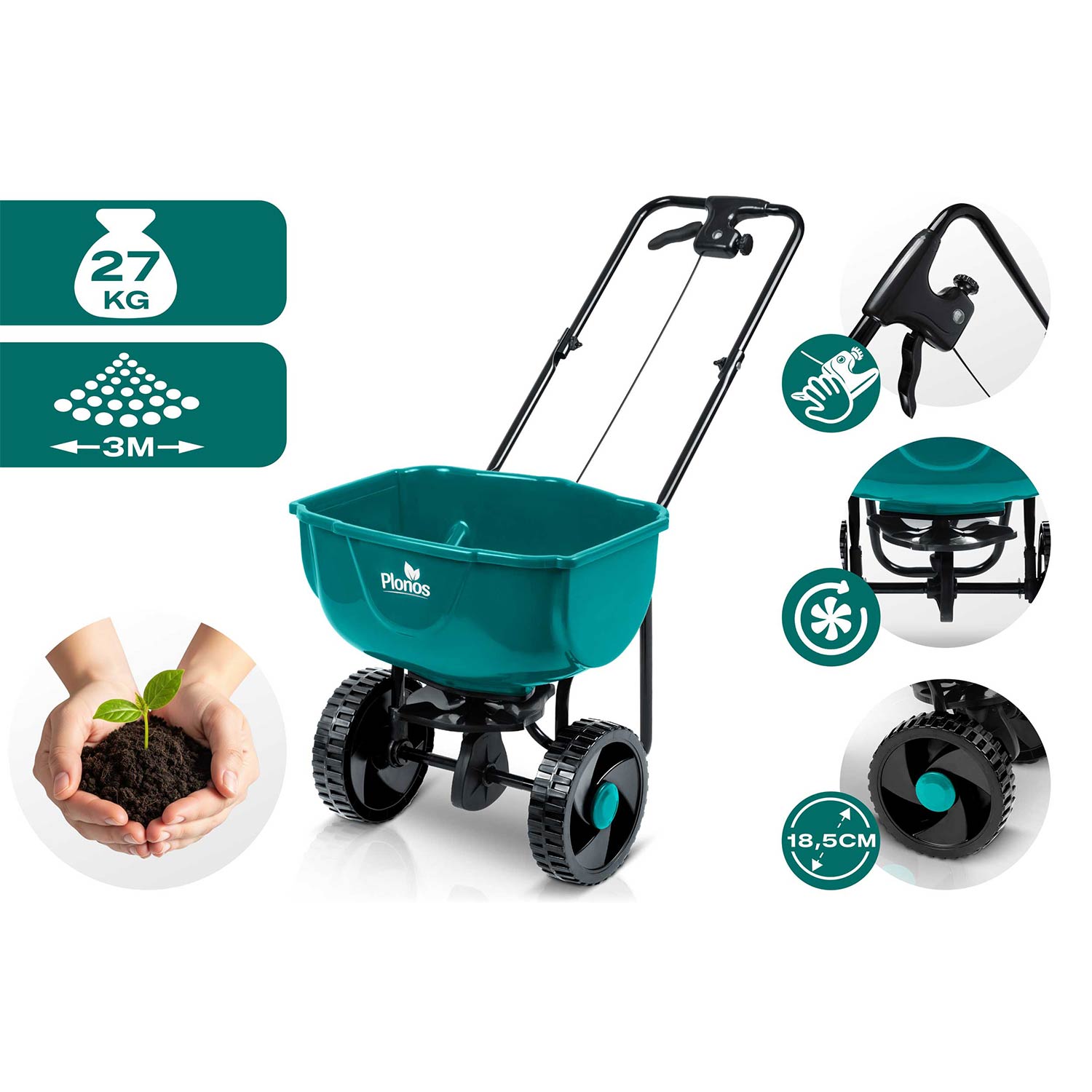 Siewnik 27 l Plonos wyróżnia się ergonomiczną rączką, która minimalizuje zmęczenie. Innowacyjna regulacja w uchwycie pozwala precyzyjnie dostosować tempo rozsiewu, a dźwignia zatrzymująca rozsiew zapewnia pełną kontrolę i wygodę w każdej sytuacji.